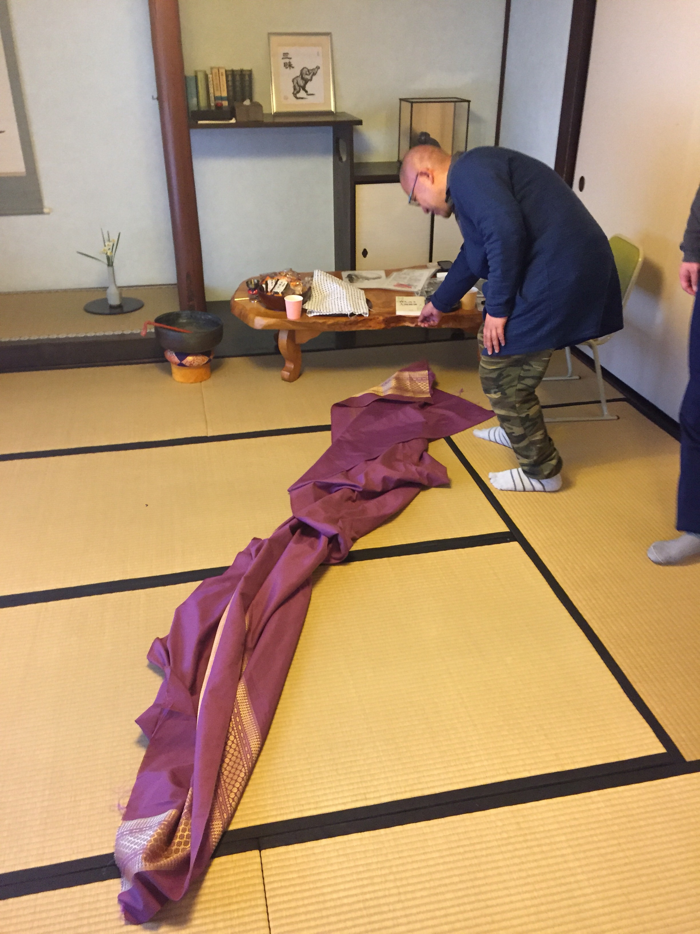 導入として、くしゃくしゃに置かれた長い布を和尚が床に置きました。